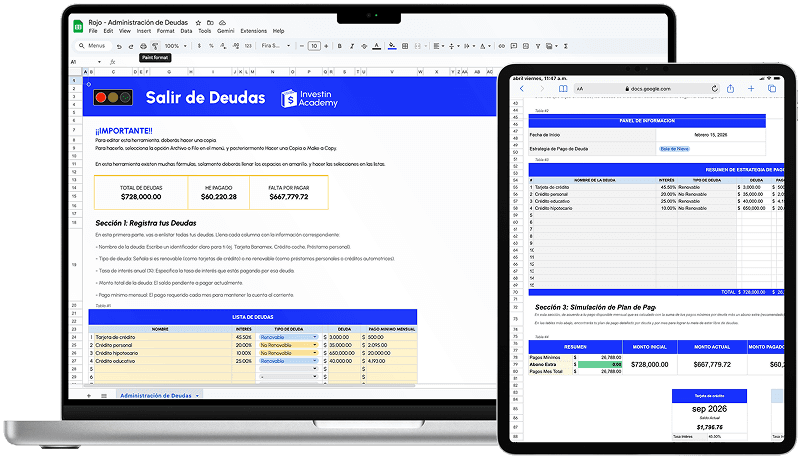 Con base en tus pagos mensuales, la herramienta calcula mes a mes tu saldo, cuánto interés vas a pagar y la fecha exacta en la que cada deuda llega a cero. Ya no es un sueño vago — es una fecha en el calendario.